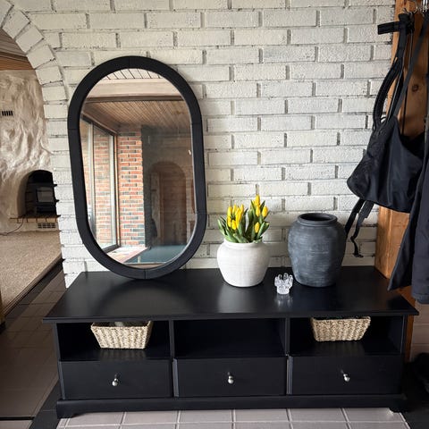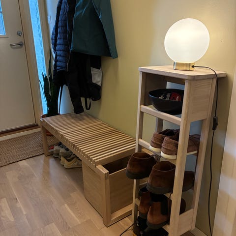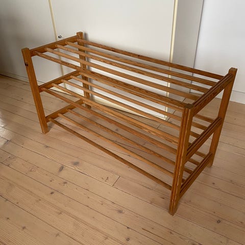 Hylla har to romslige nivåer med god plass til sko, støvler eller oppbevaring. Kan også brukes som lav benk eller hylle til annet bruk.