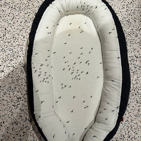 Pent brukt Voksi babynest. Det imiterte skinnet har vridd seg etter vask (se bilde), har ingenting å si for bruken.
