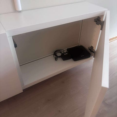 Hvit IKEA BESTÅ TV-benk selges. Benken har tre trykk-åpne skuffer med fronter i hvit høyglans. Skuffen til venstre er litt slapp når den åpnes, men fungerer ellers fint. Det er heller ingen bakplate på benken.