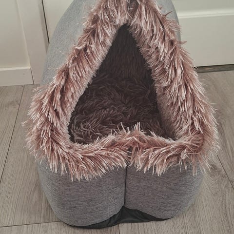 Katteseng som er veldig god og myk, men hun vil heller sove på flisene..