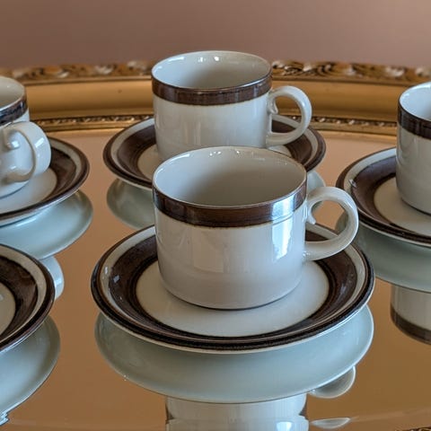 6 stk dype tallerkener, suppetallerkener eller dessertskåler fra finske Arabia, serien Karelia. Disse er brukte, men ikke mye bruksslitasje, ikke noen skader eller skjemmende merker. Disse har en diameter på ca. Ø20cm, kanthøyde ca 4cm.