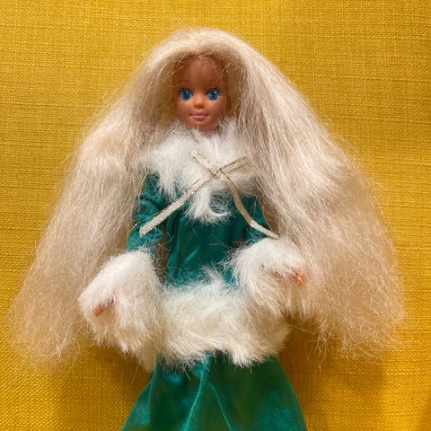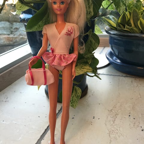 Barbie dukke med krøllete blondt hår og gul og svart rutete kjole. Dukken har bevegelige armer og ben . Merket 1966 bak . Selges for 200 kr . Kan sendes med post nord for 70 kr eller fiks ferdig . Eller kan hentes etter avtale .