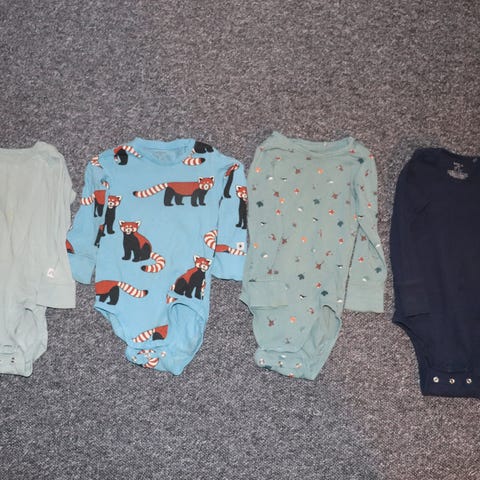 Klespakke i størrelse 86, flerfarget, passer gutt og jente. To sett/joggedresser, to pyjamaser (den grønne har lett for å åpne seg og store knappehull, kan evt. sys), en hettegenser, en Stormberg ullgenser, fire bukser og 5 sokkepar.