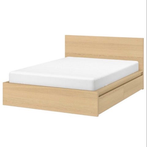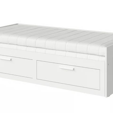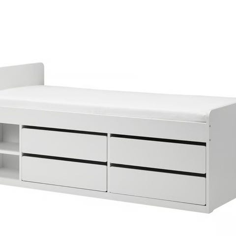 IKEA seng med oppbevaringsskuffer i hvit farge. Sengen har en solid treramme med lameller og to store skuffer under for ekstra oppbevaringsplass. Passer til standard madrassstørrelse 80 * 200 og gir funksjonell lagring i soverommet.