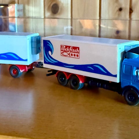 Medium lastebil modell med blå og hvit farge. Lastebilen har en tilhenger med tre aksler og er designet som en skala-modell.