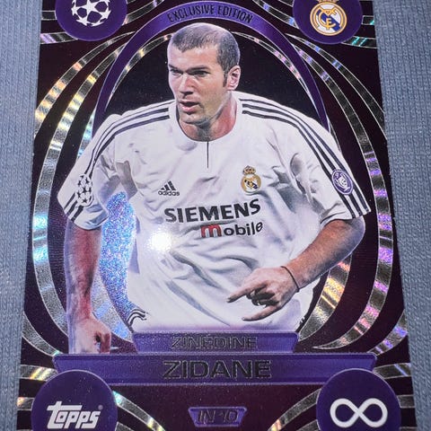 Topps Dennis Bergkamp fotballkort med bilde av spilleren i rød drakt. Kortet har statistikk med tallene 95, 98 og 82, og beskriver Bergkamps rolle som angriper og hans prestasjoner i UEFA Champions League.