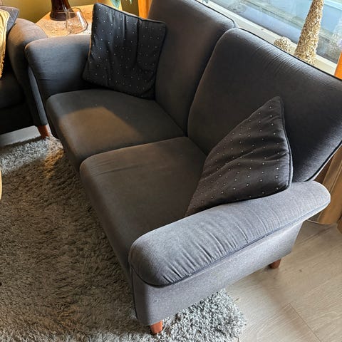 Sofa er i god stand og har avtakbar trekk på seteputene og kan vaskes. Stolen er slitt på armlenene.