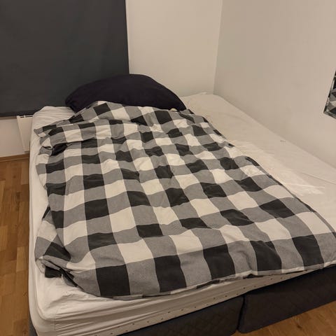 Seng gies bort ved henting.180 cm bred. Helt ok tilstand. Synlig brukt. Merke svane.