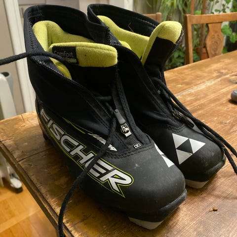 Fischer XC Ultimate skisko i størrelse 39. Skiskoene er svarte med gule detaljer og har glidelås foran. Egnet for langrenn og andre skiaktiviteter.