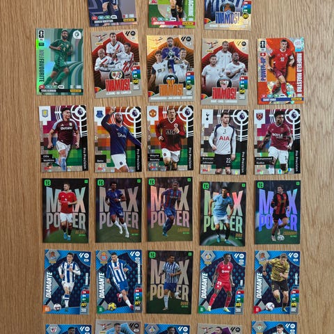 Panini fotballkort samling inkludert 5 album med ulike kort av fotballspillere. Kortene har holografiske og fargerike design, og viser spillere i forskjellige posisjoner og drakter. Passer for samlere og fotballinteresserte.