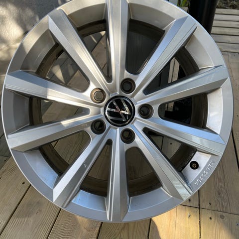 Et sett meget sjeldne Diamond Cut staggered felger i 17". Originale til Volkswagen CrossTouran med ulik bredde og innpress fremme/bak. Felgene har bruksslitasje som normalt for alderen, se bilder, alle er avbildet. Dekka som sitter på har bra mønster, men ille kantslitasje og skal ikke brukes på veg. Hjula holder luft og kan brukes til å lagre bil på eller utstilling om du driver med slikt. Er evt. behjelpelig med å montere nye dekk etter avtale. Pris ferdig prutet, kr. 4.000,- samlet/4 felger. This is last price.