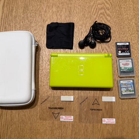 Nintendo DS spillkonsoll med to skjermer, svart farge. Bærbar konsoll designet for håndholdt spilling.