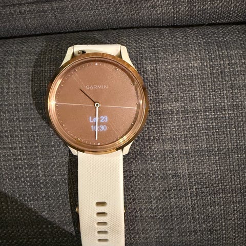 Garmin Vivomove smartklokke med lys reim. Klokken har en rund urskive og inkluderer lading via medfølgende kabel. Designet for generell bruk og aktivitetsmåling.