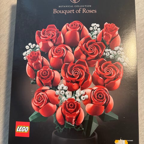 STOR - LEGO Botanical Collection LEGO blomster sett med røde roser og hvite små blomster. Settet består av 822 deler og inkluderer byggeinstruksjoner for å lage en detaljert bukett med roser og dekorative elementer.