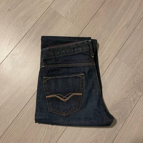 Hei, selger en pent brukt Replay jeans. Buksen er i str 34 W og 32 L. Den har et lite bruksmerke, som vises på Bilde. Ellers i god stand. Ny pris 1999
