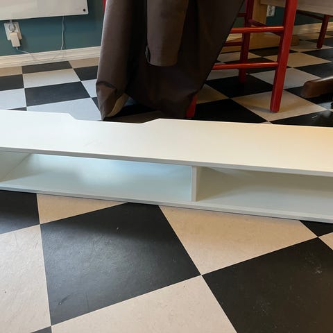 Lys grå farge. Har noen bruksmerker. Kommer med veggoppheng/planke (horisontalt).
