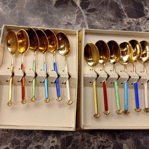 12 gafler, 12 kniver, 12 spiseskjeer, 12 t-skjeer.