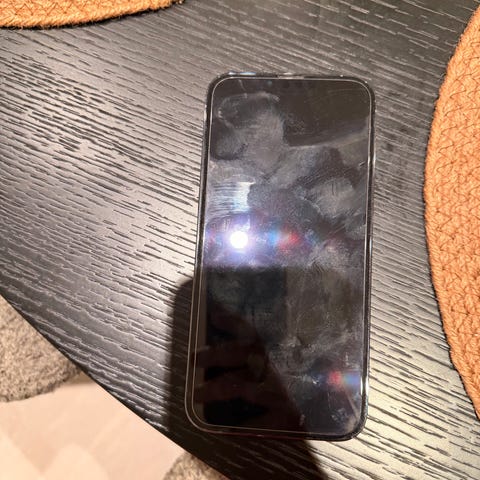 Apple iPhone 14 Pro mobiltelefon med 128 GB lagringskapasitet. Telefonen er fra 2023. Skjermen bak er knust, men telefonen har alltid hatt deksel bak, så knust skjerm kommer av støtt slag. Telefonene og kamera fungere som vanlig og skjermen foran er beskyttet med skjermbeskytter fra 1 dag.