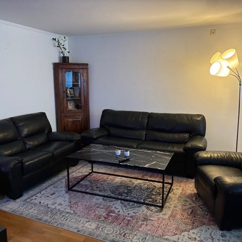 Sofagruppe i sort skinn. Sofaen og stolene har polstrede armlener og ryggputer som er fastmontert med glidelås til møblene. Møblene er romslige og store, og gode å sitte i / slange seg i. Passer til et stort oppholdsrom som en stue .