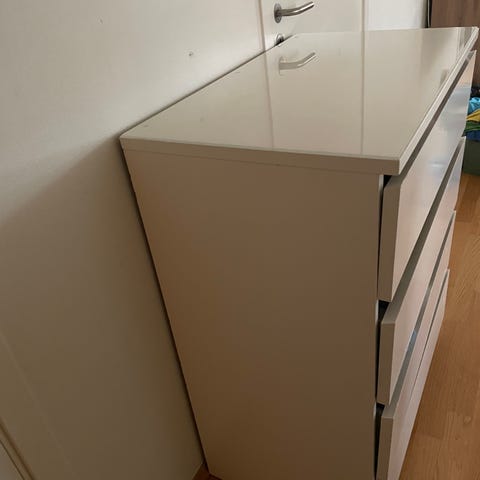 Malm kommode med 3 skuffer selges billig grunnet noen småskader på skuffene. Ellers i god stand, under 2 år gammel. Nypris 995,- Må hentes.