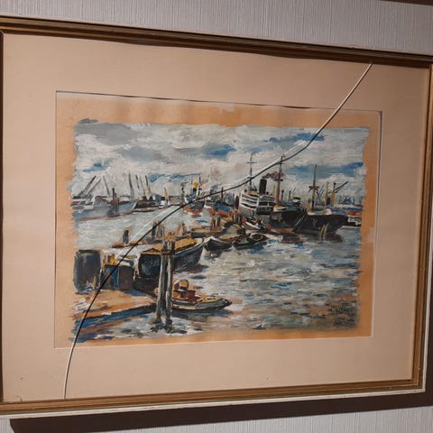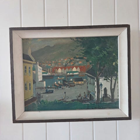 Oljemaleri med havnemotiv fra Bergen. Man ser blant annet Rosenkrantztårnet og Håkonshallen. Det er malt av Atle Håkonsen i 1952. Det er signert nederst til høyre i bildet.