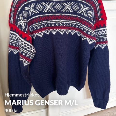 Helt ny . Strikket i en tråd tweed og to tråder silkmohair. Grått og mørkeblått vidde 110 cm, lengde ca 58 cm og ermer ca 41 cm. Dyrt garn, derav pris. Ikke tatt noe for jobben. Porto i tillegg.