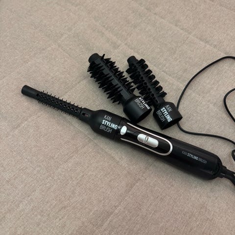 Braun Satin Hair 3 hårføner med tilbehør som inkluderer ulike børster for styling. Produktet har en svart farge og er designet for hårpleie og styling.