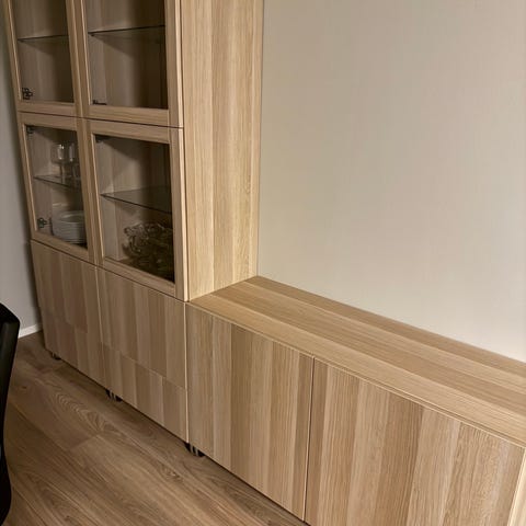 IKEA Bestå vitrineskap med skuffer i bunn og innvendig belysning med kontroll.