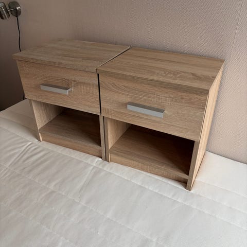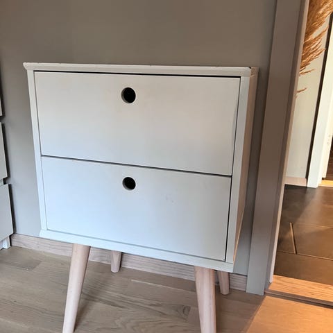 Nattbordet har 2 flekker i øverste hylle men det er ikke noe du legger merke til, og en av kantene i øverse hylle er litt skadet.