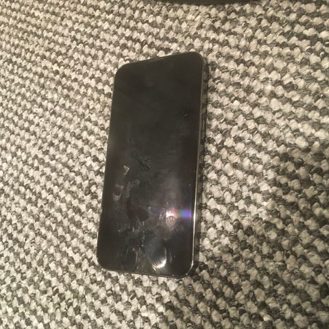 Ødelagt bakside. Byttet skjermen på fremsiden og den ble svart dagen etter. Vet ikke hva det kommer av. Mobilen er på, hører og kjenner på vibreringen at det kommer inn meldinger, telefonsamtaler osv, men skjermen er helt svart.