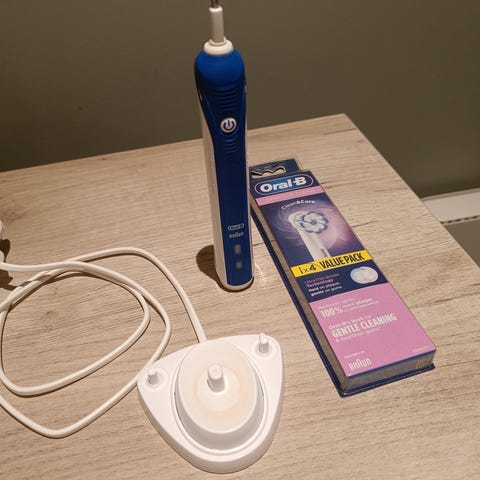 Braun elektrisk tannbørste med tilbehør og etui. Produktet er hvitt og er beregnet for personlig pleie.