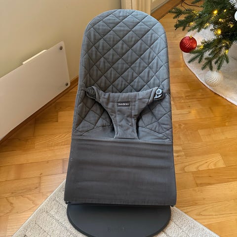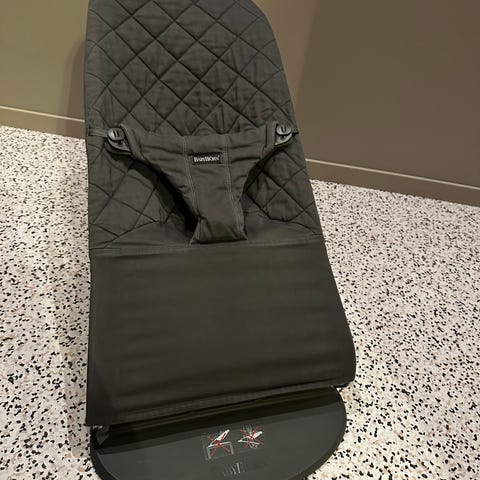 Babybjörn vippestol i beige farge. Stolen har en enkel og funksjonell design med stoffsete og metallramme. Egnet for små barn som trenger en komfortabel og trygg sitteplass.