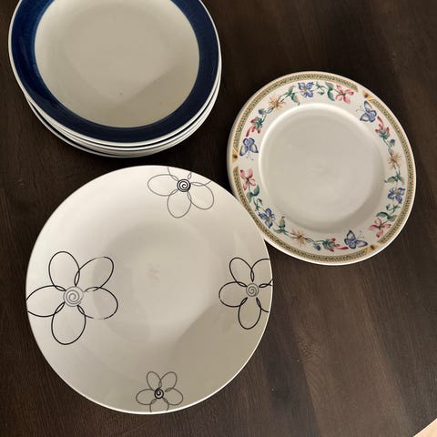 Fem små tallerkner og seks middagstallerkener gis bort. En del riper i tallerknene