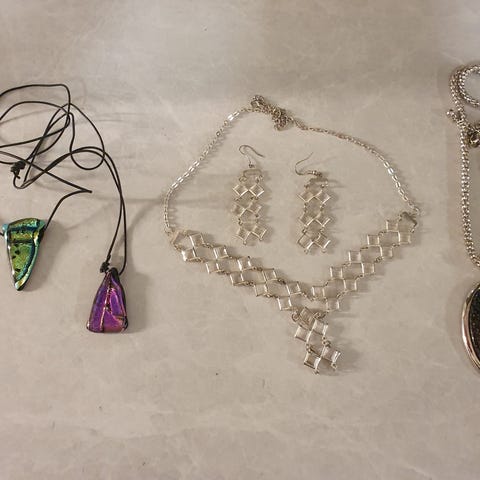 øredobber i stein/glass ? og sølv. 5,5 cm lange og 3 cm i b. Vekt 10 g.