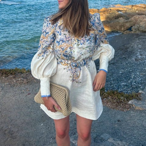 Zimmermann Sommerkjole i størrelse 0 - XS, flerfarget mønster og laget av lin. Kjolen har lange ermer og inkluderer et belte i samme materiale og farger.