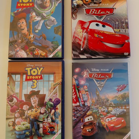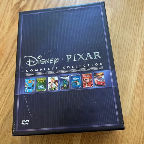 Samling av Disney Pixar DVD-filmer med barnefilmer inkludert titler som Toy Story 2, Bolt, Se Opp, Små Kryp, Kung Fu Panda, Shrek-serien og Vingenes Herre. Filmene er i DVD-format og passer for barn.
