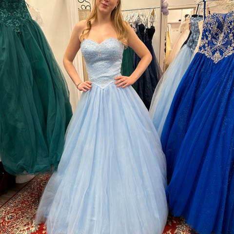 Jeg har valgt å selge min ballkjole, da den bare henger i skapet. Kjolen er brukt 2 ganger til skoleball og er en lyseblå Alexandra Ritzi kjole. Kjolen passer meg som er en smal og 170 høy. Fremstår som ubrukt uten synlige bruksmerker. Ta kontakt hvis du er interessert og ønsker å prøve.