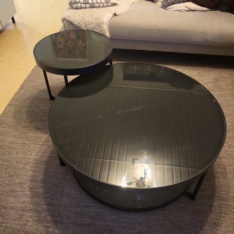 Selger et sett med to stilrene, runde stuebord i sort. Bordene er i svært god stand, uten synlige bruksmerker.