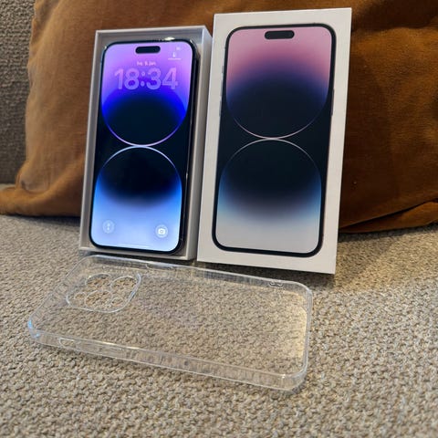 Apple iPhone 14 Pro mobiltelefon med 128 GB lagringskapasitet. Telefonen har en farge i mørk lilla og leveres med original emballasje og ladekabel.