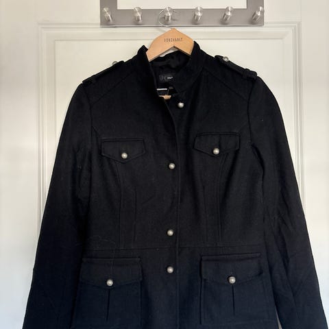 Brukt en håndfull ganger. «Silkestoff» så ikke veldig tøyelig. Fin blåfarge med sølvstriper ved hals og håndledd. Strikk nedre kant. Glidelås. Fra Divided H&M. Lengde ca 65 cm. Str 44, men kanskje mer 42. Hbo 100 kr.