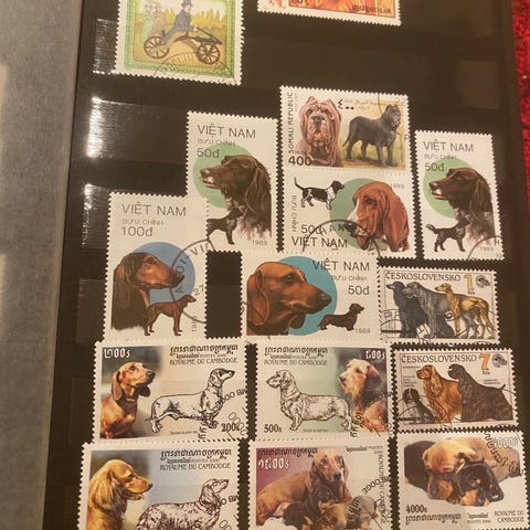 Rødt Fischer frimerkealbum med 32 sider med spennende frimerker fra verden.