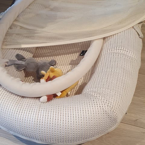 Kjempefin og solid vippestol i tre. Litt retro? Trekk i grønn og hvit. Uro hører til.