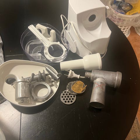 Kenwood PRO 1500 kjøkkenmaskin i hvit farge med tilbehør for ulike matlagingsoppgaver. Maskinen har en kraftig motor og leveres med deler som , eltekroker og kjøttkvern, egnet for allsidig bruk på kjøkkenet.