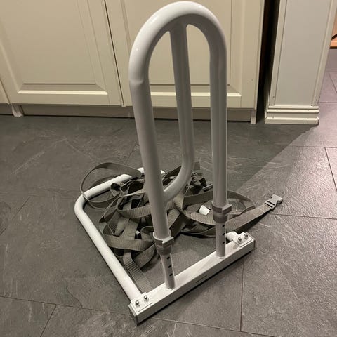 Justerbar sengegavl med grått stofftrekk og hvit metallramme. Designet for enkel justering av ryggstøtte i flere posisjoner. Passer til bruk i seng for økt komfort ved lesing eller avslapning.