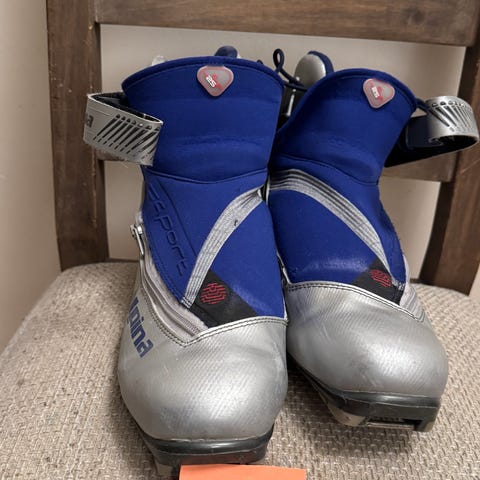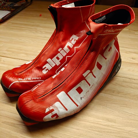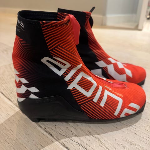 Alpina Classic Pro skisko i svart og rød farge. Skiene har snøring og glidelås foran for enkel påkledning. Egnet for klassisk langrenn. Str. 38.5.