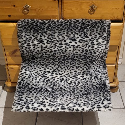Radiatorseng med plysjtrekk i beige farge.