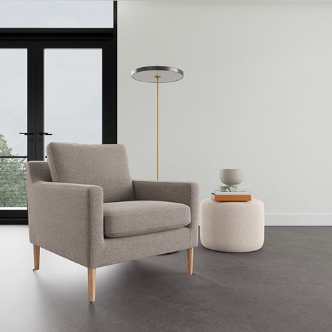 De er trukket i Minottis karakteristiske teksturerte kvalitetsstoff i lys beige-grå-greige, en slitesterk og elegant naturfiberblanding. Stoffet gir et lunt uttrykk og fremstår svært tidløst.