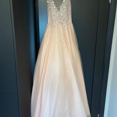 Selger ballkjole kjøpt på Diin i januar 2025. Kjolen har perledetaljer og lommer med plass til telefon.