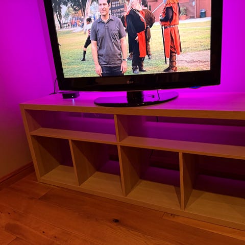 Stilig TV-bord til salgs. Står på 4 føtter av stål. Topp platen er noe bøyd. Ser verre ut på bilde. Se evt bilde.