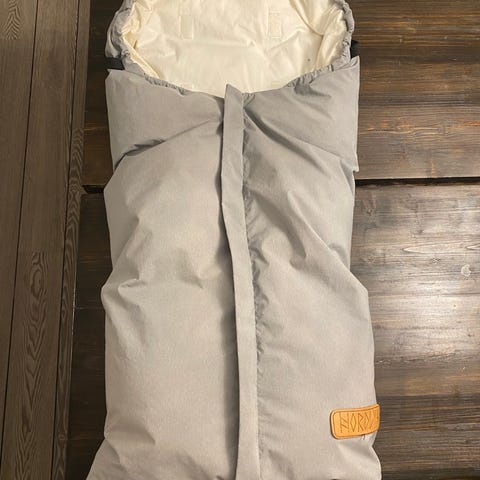 Vognpose / sovepose i grå av merket Nordlys. Laget av 75% hvit dun og 25% polyester. Innerfôret består av 100% bomull. Vognposen er unisex og har standard Oeko-Tex 100 sertifisering. Egnet for bruk i barnevogn for å holde barnet varmt.